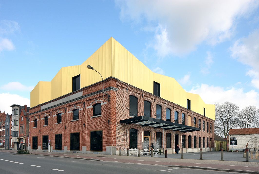 Pour la réalisation du programme du musée, on a construit sur la toiture un hangar en acier, extension logique de la construction industrielle. La trame des colonnes en acier existantes a été poursuivie. Les poutres sont posées en diagonale les unes sur les autres à des hauteurs variables. Le revêtement à l’aide de tôles ondulées en métal couleur or est une allusion à la Golden River, la Lys, qui est connue pour la culture du lin. Un escalier en acier monumental a été intégré dans la structure portante existante.