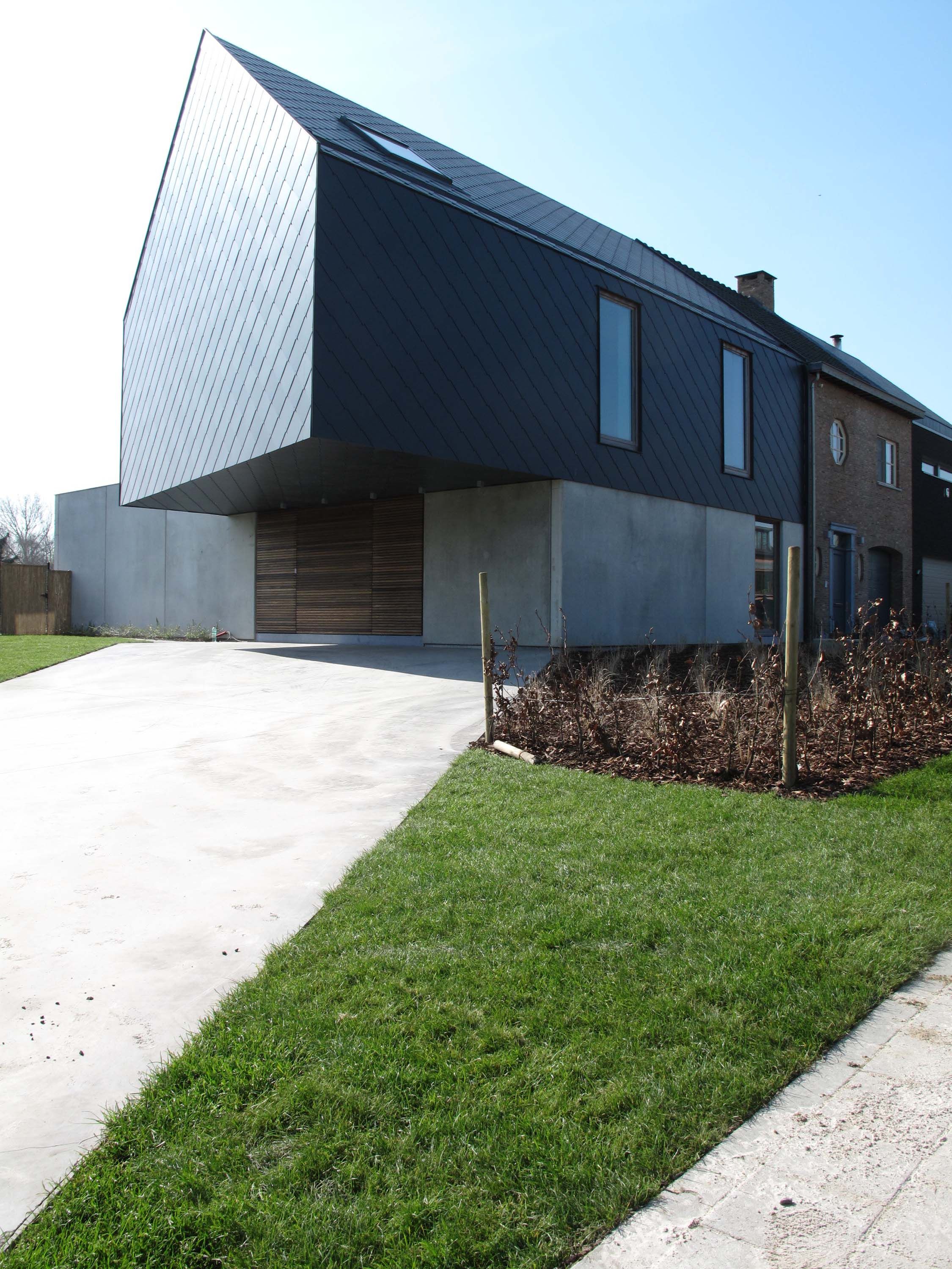 Op een sokkel in gladde betonnen sandwichpanelen wordt een monoliet volume geplaatst, uitkragend boven de oprit. Dit volume met galva-steeldeckplaten en binnendozen wordt volledig bekleed met vezelcement ruitleien. De verschillende bouwlagen zijn verbonden door trappen in gepoederlakte staalplaat.