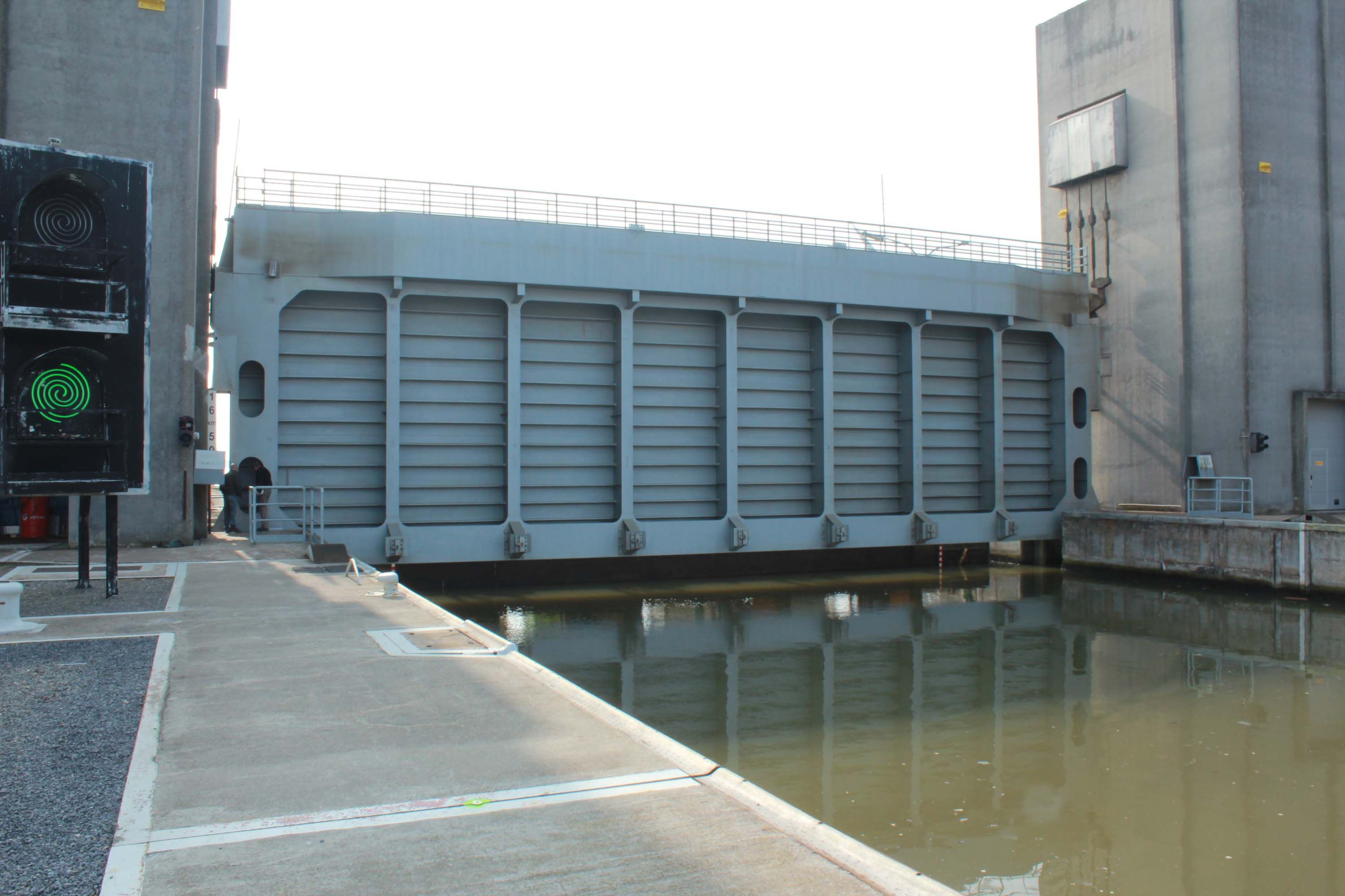 De deur zelf is opgebouwd uit een verstijfde huidplaat die zijn belasting afdraagt naar zware verticale verstijvers.