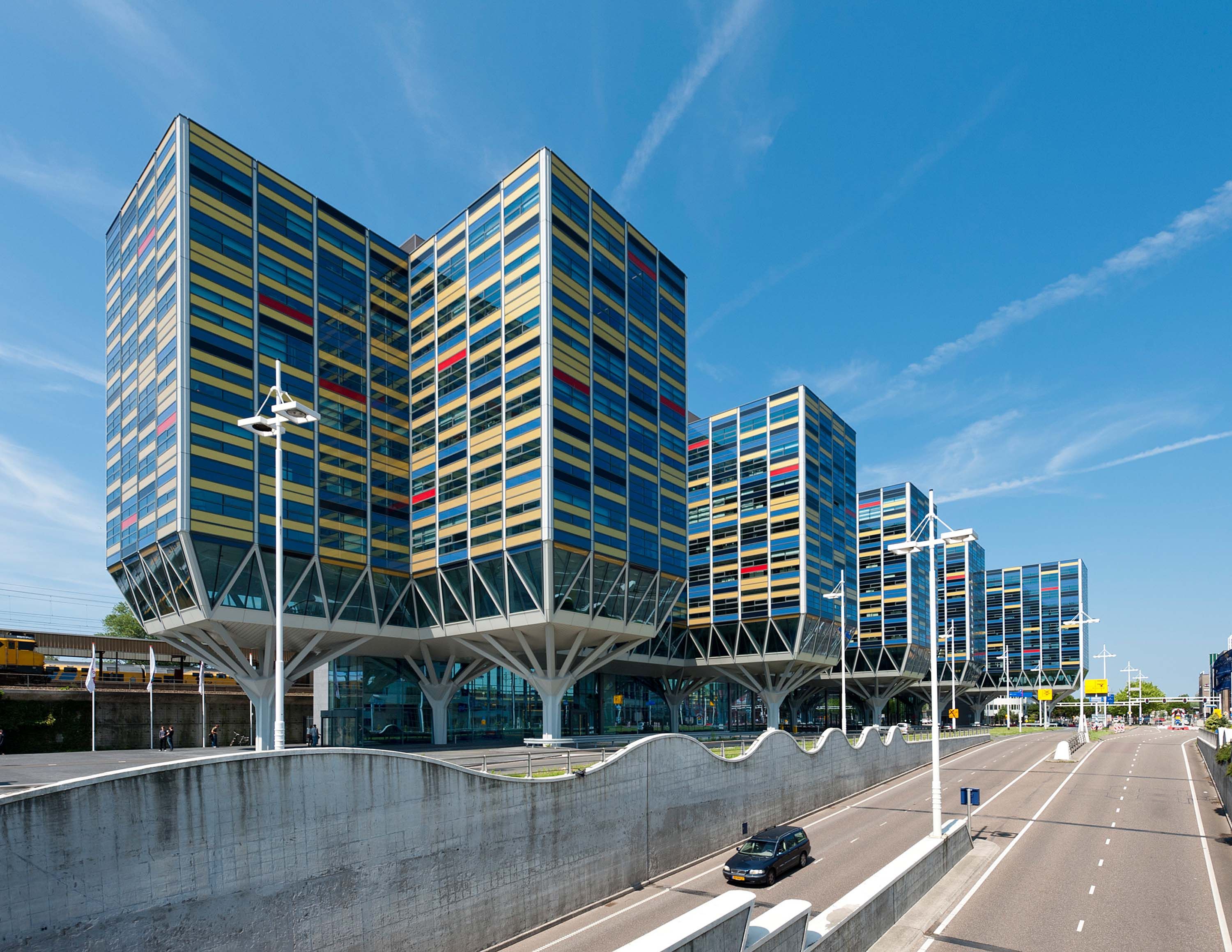 Het kantoorgebouw ‘Le Carrefour’ van Achmea vormt een landmark in Leiden. De kleurrijke gevel verwijst naar Theo Van Doesburg die in de jaren ’20 van vorige eeuw in Leiden de kunstbeweging ‘De Stijl’ oprichtte.