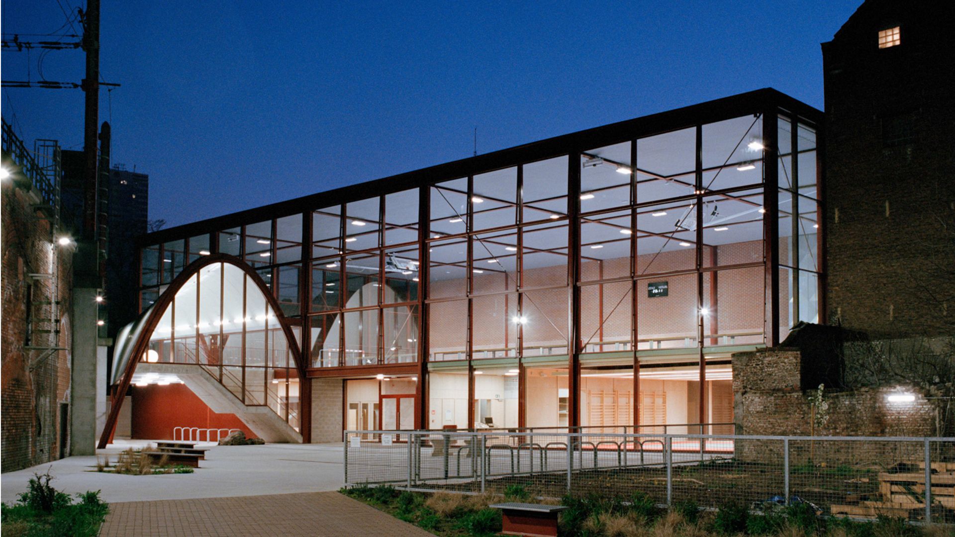 La salle de sport Terre-Neuve s'installe au cœur de Bruxelles, sur un terrain exigu, coincé entre l'arrière d'un immeuble et la voie ferrée de la Jonction Nord-Midi à Bruxelles. Le projet comprend deux volumes distincts, en harmonie avec l'univers ferroviaire environnant. La petite salle polyvalente est abritée sous un dôme autoportant en tôles d'acier, tandis que la grande salle de sport repose sur une structure en acier plus classique, avec une attention particulière portée à la conception de la façade.