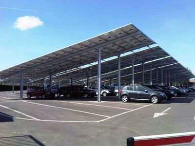Als basisstructuur werd gekozen voor een staalconstructie. De overkapping wordt gevormd door een reeks halfcirkelvormige profielen, die als portieken dienen en waarop de draagstructuur voor de dakbedekking bevestigd wordt. Samen met de ontwerper werd bedacht dat de symbiose tussen het architecturale en het functionele nog zou verbeteren door het gebruik van zonnepanelen als dakbedekking. De ronde vorm van de portieken bleek niet alleen een speelse toets te geven aan het geheel, maar zorgde er ook voor dat de dakhelling vrij eenvoudig kon worden afgestemd op de optimale helling voor de zonnepanelen. Zo werd ook automatisch een goede schaduwwerking en beschutting gecreëerd voor de auto’s.</p>