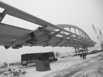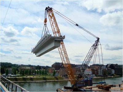De montage gebeurde op een voormontageplaats naast de bestaande brug. Segmenten van 24 m lang en 90 ton zwaar werden aangevoerd en daar samen gelast. Om aan de bestaande sporen aan te sluiten werd de nieuwe brug 8 m in de dwarsrichting verschoven. De mogelijkheden van de staalbouw komen hier ten volle tot hun recht.</p>