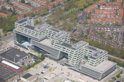 Tekst: <p>Het Community College in Leiden is een groot complex dat naast twee scholen plaats biedt aan een sportcentrum, supermarkt, restaurant, bank en parkeergarage. Met zijn vloeroppervlakte van 56.000 m2 is het een van de grootste scholen van Nederland.<br>