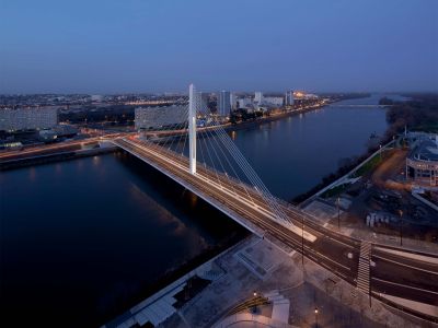 Tekst: <p>De tuikabelbrug “Pont Eric Tabarly”, genoemd naar de Franse oceaanzeiler, is een ontwerp van architect Marc Barani. Ze verbindt twee belangrijke delen van het stadscentrum van Nantes, die tot voor kort door de Loire gescheiden waren.<br>