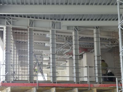 Tekst: <p>De staalstructuur van het kantoorgebouw van de ZAC in Bruyères bestaat in hoofdzaak uit een draagstructuur voor een staalplaatbetonvloer, waarbij de liggers met deuvels in het beton verbonden zijn zodat deze liggers als samenwerkend staal-beton worden berekend. Daardoor worden de spanningen in het staal kleiner en is de doorbuiging beperkter.<br>