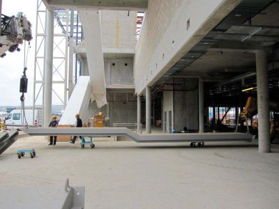 De trappen werden in één stuk in het atelier aan elkaar gelast en gemonteerd tussen de reeds geplaatste roltrappen. Op het moment van de montage was het dak reeds afgewerkt zodat er niet met een grote kraan kon gehesen worden. Er kwamen kleine hulpstructuren aan te pas en de trappen dienden ter plaatse met takels gehesen te worden.<br>
