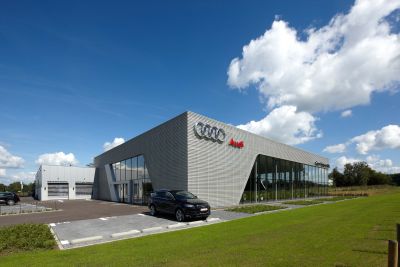 De Audi-showroom van Coox Motors werd ontworpen volgens het Terminalconcept van Audi, een visionaire architectuur met een design uit meerdere lagen. Er werd gebruik gemaakt van een stalen draagstructuur en stalen gevel (Alu-geperforeerde plaat) met honingraatstructuur. De grote glaspartij maakt de strakke look compleet. De eyecatcher in het interieur is de gebogen wand, bekleed met zwart steentapijt.<br>