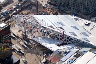 De staalstructuur wordt gedragen door 4 unieke hoofdspanten met een vrije overspanning tot 120 m. De spanten van de in 2 richtingen gezeegde dakvlakken bestaan uit zowel vakwerkstructuren als uit plaatmateriaal opgebouwde elementen met een plaatdikte tot 100 mm. Dak en geveldelen kregen een toplaag van RVS 316L met een dikte van 0,5 mm. Uniek detail: de 3.500 ton wegende staalconstructie boven het nieuwe metrostation moest zo worden gebouwd dat de oppervlaktedruk op het metrodek niet groter was dan 1 ton/m2.</p>
