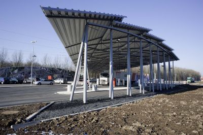 Tekst: <p>Het dubbele tankstation van Ruisbroek strekt zich symmetrisch langs beide zijden van de E19 autosnelweg, aan de rand van Brussel, uit. De brandstofverdeling is in een hoek van 45° ingeplant, in overeenstemming met de inrichting van de site. Ze is beschut door een stalen luifel met gebogen bedekking, gevormd door vijf overlangse facetten in gegolfde staalplaat. De slanke structuur bestaat uit lensvormige liggers met kabels voor het windverband, gedragen door dubbele buisvormige kolommen. De gevels van de aanpalende boetiek in staalplaat zijn versierd met monumentale luchtfoto’s van de stad Brussel en haar periferie. Het tankstation aan de oostzijde wordt verder vervolledigd met een restaurantgebouw en een verdeler van vloeibare waterstof, bekleed met verzinkt gestrekt staal. Het tankstation aan de westzijde, in de richting van de hoofdstad, wordt aangekondigd door de monumentale gevel van een hotel (in aanbouw) dat als een paviljoen in het park is ingeplant. </p>