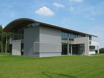 <p>De staalstructuur werd aangebracht op een massieve onderbouw. De gevels en het gebogen dakvlak werden afgewerkt in geprofileerd metaalbekleding. De loopvlakken aan de buitenzijde van het gebouw werden voorzien in verzinkte stalen looproosters. De borstweringen en muurafdekkingen bestaan uit geborstelde inox. Een deel van de gevelbekleding werd afgewerkt in geolied cederhout. </p>