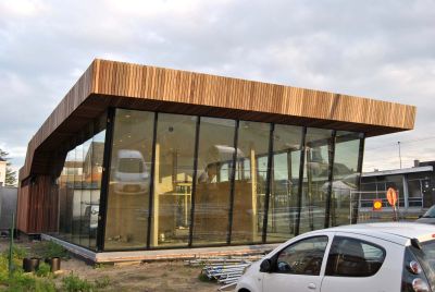 Tekst: <p>In Buggenhout, in de schaduw van het station, huisvest dit uitdagend gebouw ziekenfondsdiensten. Hierbij werd gekozen voor een éénlagig ‘paviljoen’ waarin alle ruimten op het gelijkvloers gesitueerd zijn en dus optimaal toegankelijk. Het gebruik van grote glaspartijen benadrukt deze toegankelijkheid en dient het lage-drempel-gevoel te intensiveren. Het visueel doorlopen van het dak naar een luifel zorgt hierbij voor de noodzakelijke bescherming tegen oververhitting in de zomer. Kenmerkend voor het gebouw is dat er geen enkele dragende functie binnenin de ruimte aanwezig is: het stalen buitenschrijnwerk werd zodanig berekend dat het volledige dak gedragen wordt door stalen kokers en zodoende de functie krijgt van dragend schrijnwerk. De inclinerende kopse gevel was daarbij een extra uitdaging, mede doordat alle ramen zijn voorzien van driedubbele beglazing.