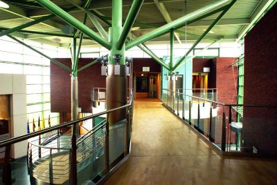 Tekst: <p>Het nieuwe administratief centrum in Wolvertem, is een samensmelting van diverse blokken met het atrium, waarop alle diensten uitgeven. Het symboliseert de openheid van het stadsbestuur. <br>De dakstructuur van de inkomhal en het atrium is een vlakke ongeschoorde staalstructuur met rondom rond glazen gevels. De dakstructuur is onafhankelijk en kan zich ten opzichte van de gevel verticaal vrij bewegen. De dakplaat, met uitkragende dakrand, wordt gedragen door vier ronde kolommen van 10 m hoogte. De kolommen eindigen stervormig net onder het dak en ontplooien zich als een parasol. De regenafvoer gebeurt via de kolommen, waardoor het dak afhellend is naar binnen. De passerelle in het atrium hangt met trekkers aan de dakstructuur.