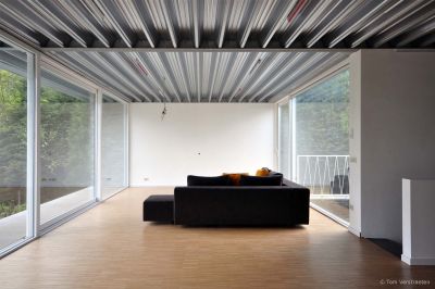 Tekst: <p>Voor de uitbreiding van de woning uit 1960 werd gekozen voor een volledig losstaande bovenbouw, steunend op vier massieve wanden. Het was immers onmogelijk om op de bestaande structuur een verdieping te bouwen: het gelijkvloers had rond om rond een overkraging van 70 cm ten opzichte van de kelder en het plat dak bestond uit een houten roostering. De traphal is de enige verbinding tussen de twee bouwvolumes. Een stalen structuur was de ideale oplossing om de overspanning van 17 m te realiseren. Zowel de vier buitengevels als de gebogen dakstructuur werden volledig uit staal gemonteerd. Het geheel van wanden en dak werd met een houten geïsoleerde structuur opgebouwd. Aan de buitenzijde werd het gebouw volledig afgewerkt in zink.</p>
