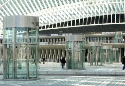 Tekst: <p>Het project bestaat uit de realisatie van 6 staalstructuren voor de panoramische liften die de reizigers van de winkelgalerij naar de perrons en de hoger gelegen loopbruggen moeten brengen. De geheel is uitgevoerd in een lichte buisstructuur van roestvast staal. Ze is opgebouwd uit opeenvolgende ringen die door fijne kolommen met elkaar verbonden zijn. De werken dienden eveneens de uitvoering van het gebogen glas te omvatten. Het gelaagd glas wordt met metalen strips op de ringen vastgeklikt. De technische delen van het kunstwerk worden bekleed met platen van geborsteld inox, korrel 320, waardoor het bovenste deel van de liftkokers een blinkend aspect vertonen. Het esthetisch uitzicht is in harmonie met de rest van het gebouw, en meer in het bijzonder de stalen ramen van de vitrines van de boetieks.</p>