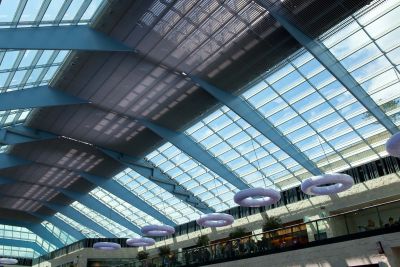 Tekst: <p>Voor het nieuwe winkelcentrum K in Kortrijk werd één van de grootste koepels van het land ontworpen. Hij is 112 m lang en 32 m breed. De constructie bestaat uit 13 spanten die de 32 m overspannen. Deze spanten hebben een hart op hart afstand van 8 m en dragen de stalen gordingen. Deze fungeren als kipsteunen voor de spanten. De spanten zelf bestaan uit plaatmateriaal die aan elkaar gelast zijn tot kokerliggers en zijn slechts 150 mm breed. De keuze voor staal was snel gemaakt, gezien het eigen gewicht, de vorm en de slankheid van de draagstructuur. Omdat het betonnen skelet van het onderliggende winkelcentrum door temperatuurschommelingen anders reageert dan de staalconstructie van de koepel, hebben de opleggingen van de stalen spanten enige bewegingsvrijheid in de langsrichting van de koepel.</p>