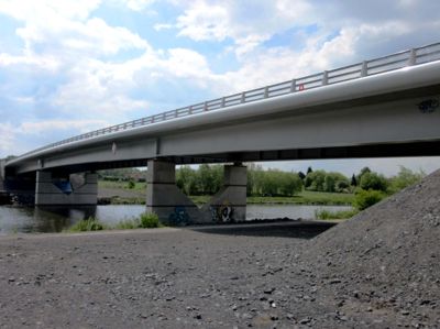 Tekst: <p>De van 1925 daterende spoorwegbrug ter hoogte van het Galluspark te Frankfurt moest worden vervangen, waarbij de ligging en de overspanning aangepast werden.<br>Er werd gekozen voor rode stalen boogbrug - enig in Frankfurt - met een overspanning van 86,10 m, een breedte van 8,70 m en een hoogte van 14,50 m voor een totaal gewicht van 893 ton staal.<br>De landhoofden en einddwarsdragers staan loodrecht op de lengteas. De hoofdliggers en bogen hebben een kokerdoorsnede. De brug heeft een orthotroop wegdek met dwarse ondersteuning om de 750 mm, van hoofdligger naar hoofdligger.<br>
