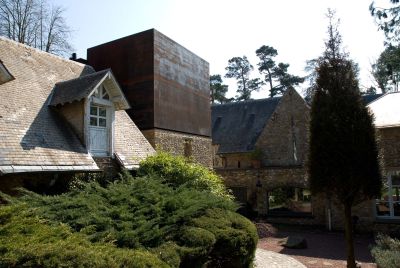 Tekst: <p>Een vorm, een massa ... een toren, een donjon! Belangrijk in dit project was dat de kracht van het oorspronkelijke concept behouden moest blijven, vrij van architectonische kunstgrepen of staaltjes van technisch kunnen. Daarom koos de architect ervoor om radicaal met weervast staal te werken. Het was een gelegenheid om te experimenteren met een ander bouwconcept: een volume volledig in zelfpatinerend structuurstaal, vervaardigd in de werkplaats om het dak van de kapel te vervangen. Dankzij de kubus, met ribben van ongeveer 6 m, wordt het bestaande volume in de hoogte verdubbeld en worden drie niveaus gecreëerd. Het uiterlijk van het warmgewalste zwarte staal verandert elke dag en krijgt geleidelijk aan zijn typische roestkleur waardoor het aansluit op de zandsteen waarin de basis is opgetrokken. Is het blok massief of is het hol? De architectuur laat niets los over haar technische karakter of haar plan, wars van alle gekunsteldheid ... dankzij het staal!