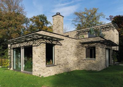 Tekst: <p>Dankzij haar vorm, het uitgekiende materiaalgebruik en de specifieke kleurkeuze is deze eengezinswoning met architectenbureau perfect ingebed in de groene omgeving. Het idee was om oververhitting via de zuid- en westgerichte glaspartijen te vermijden door middel van schaduwrijke en verkoelende klimplanten op drie stalen luifels. Deze laatste zijn telkens opgebouwd uit drie vlakken, ingedeeld in segmenten met een wederkerend patroon en opgehangen tussen stalen vinnen die aan de ruwbouw bevestigd zijn. </p>