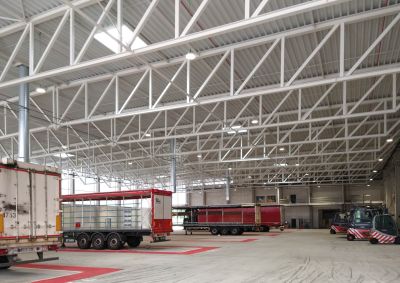 Tekst: <p>Dit grootschalige project omvat een prefabbetonnen kantoorgebouw van 3200 m² en een enorme logistieke hal van 30.000 m², die is opgetrokken in staal. Deze laatste bestaat uit een regelmatig ras-ter van kolommen. Alle dakbalken, zowel de hoofd- als de secundaire liggers, zijn opgevat als stalen vakwerkliggers, die behandeld zijn met brandwerende REI30-verf. </p>