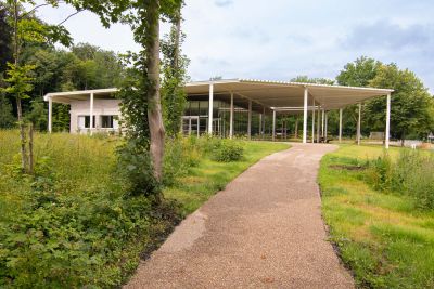 Tekst: <p>Glas, staal en beton. Dat is het materiaal waaruit het nieuwe onthaalpaviljoen van het kasteel van Gaasbeek is opgetrokken. Het gebouw valt op door zijn slanke vormen die wonderwel in het golvende landschap passen.</p>
