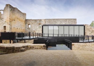 Tekst: In de zogeheten ‘Vallei van de Zeven Kastelen’, meer bepaald in Koerich, kunnen bezoekers en kunstenaars genieten van een geslaagd huwelijk tussen historisch erfgoed en hedendaagse functies. Passerelles, platformen, toegangshellingen en trappen creëren er een uniek parcours. Eens zo bijzonder is dat deze toevoegingen in de toekomst verwijderd kunnen worden zonder al te veel sporen na te laten. Er werd geopteerd voor staal omdat het licht, slank en recycleerbaar is. Het is op verschillende manieren toegepast: als gespannen, geboute en gelaste structuur, als metaalgaas, als inoxgrid en -kabels, als gepoedercoate elementen … Gezien de blootstelling aan weer en wind, bestaan bijna alle metalen onderdelen uit rvs van hoge kwaliteit. Er zijn twee soorten afwerkingen toegepast: een zwarte tint voor de onderdelen die rechtstreeks aansluiten op de bestaande bebouwing en een inoxafwerking door middel van glasstraling voor de staalelementen die bij de textieloverkapping horen. Een architecturale PTFE-bekleding siert het podium.