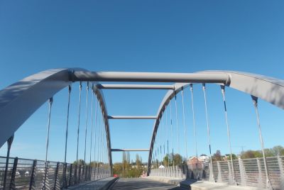 Tekst: De kern van de nieuwe brug van Verviers – met een overspanning van 22 m en een breedte van 4 m- bestaat uit een gelaste plaatligger (PRS - Poutre Reconstituée Soudée) met variabele hoogte die twee wegen afbakent, een vlak stuk voor de fietsers en een boogvormig deel voor de voetgangers. Het wegdek steekt aan weerskanten uit over de centrale balk die als het ware de ruggengraat vormt. De torsiekrachten veroorzaakt door asymmetrische belastingen wordt opgenomen door een "uiteengetrokken" boog, gevormd door de zijdelingse buizen: de ene rechtlijnig die de taak van trekstang op zich neemt en de andere die van de boog.