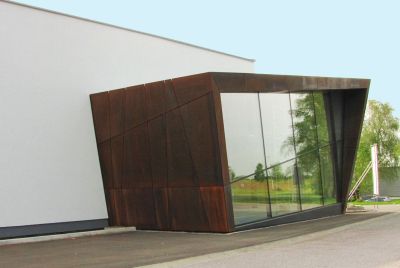 Tekst: Voor de moderne meubelzaak Side in Aarlen werden de drie gevels en de omranding van de beglaasde wand met cortenstaal bekleed, goed voor een totaal van 140 m². De platen volgen het schuine patroon van de al even schuine gevels. Om het hedendaagse karakter van het project te benadrukken, werden de platen afgewerkt met scherpe randen met een holle voeg van 12 mm. Ook de randen tussen de verschillende gevels zijn niet afgeschuind. Er is geen enkele zichtbare bevestiging. De glazen wand bestaat ook uit een schuine gordijnmuur, opgebouwd uit licht en zeer dun staal dat aansluit op het stalen geraamte van het gebouw.