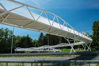 Tekst: De witte fietsersbrug over de Westerring in Genk valt vooral op door haar wervelend uitzicht. Twee slanke buiselementen kronkelen over de weg, net zoals bij een rollercoaster. De vorm van de bug is minutieus afgestemd op de krachten die ze ondergaat. De bogen en de vakwerken werken samen en zorgen ervoor dat (de sterkte van) iedere kilo staal (S355 J2) optimaal benut wordt. Het resultaat van deze oefening is een verfijnde, fluctuerende constructie.