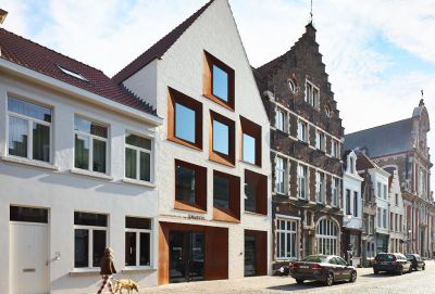 Tekst: De unieke raamkaders in weervast staal ('corten') springen meteen in het oog. Ze zijn stuk voor stuk ingefreesd met tekst of illustratie en vormen een hedendaagse interpretatie van de klassieke raamomlijstingen. Door het glas in het vlak van het staalkader te plaatsen, worden de raamomlijstingen onzichtbaar en functioneren de vensters als polaroidfoto’s waar de toerist zelf onderdeel van wordt.