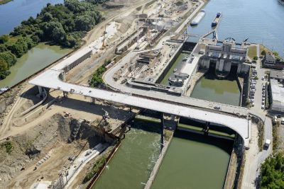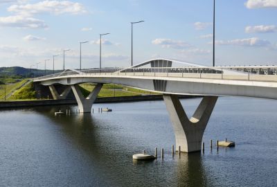 Tekst: In het kader van de realisatie van het multimodaal platform Trilogiport in Hermalle-sous-Argenteau, werd een nieuwe brug over de Maas gebouwd met een totale lengte van ongeveer 300 m. Zijn grootste overspanning bedraagt 88 m. De dragende structuur bestaat uit twee metalen balken met variabele hoogte (staal S355 en S460), verbonden door een betonnen brugdek dat uitloopt op de metalen brugstukken (S355).