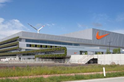 Tekst: Nike heeft haar Europees Logistiek Centrum in Ham uitgebreid met een innovatief nieuw complex. Het hele complex bestaat naast het kantoorgebouw uit verschillende blokken; low-bay, conveyor zone en twee high-bays terecht. In die high-bays kunnen tot wel 18 miljoen paar schoenen worden gestockeerd. Voor de staaltechniek van de high-bays paste het designteam het clad-racking-principe, een volledige rekstructuur uit gegalvaniseerd koudgevormd staal, die dient als opslagruimte én als achterliggende geveldraagstructuur.