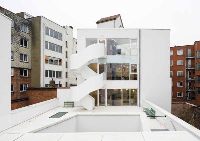 Tekst: <p>Le projet du CBAI (le Centre Bruxellois d'Action Interculturelle) se développe autour d’une cour intérieure.</p><p>Un escalier extérieure muni d’un auvent, en tôle de métal perforé, forme une nouvelle circulation pour tout le personnel du bâtiment. En lui donnant des qualités spatiales, la circulation devient une véritable promenade architecturale qui valorise le jardin. L’escalier devient, grâce aux larges terrasses qu’il propose à chaque classe, plus qu’une simple circulation extérieure.</p><p>Le principe constructif est basé sur un porte-à-faux qui permet de franchir 17 m sans appuis dans le jardin. Les garde-corps fonctionnent en poutre-treillis. Cette astuce permet d’assurer la stabilité de l’ensemble sans qu’on ait l’impression que l’effort fourni soit important.</p><p>La forme, qui serpente le long de la façade est dictée par les distances nécessaires par rapport aux fenêtres de la façade afin de respecter les normes incendies en vigueur. </p>
