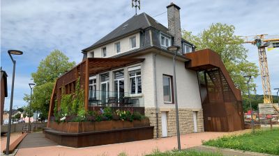 <p>Voetgangersstromen worden gecoördineerd door 3 rotsmassieven van weervast staal ('corten') die langs de hoofdweg zijn geplaatst. Deze elementen doen denken aan de kleur en het vakmanschap van de staalnijverheid in de Minette - een streek in het zuiden van Luxembourg en het noorden van Lotharingen, genaamd naar een ijzerertssoort. De vierde rots, het terras, is geënt op het bestaande gebouw, in directe relatie met de gemeenschappelijke leefruimte. Het ligt op het zuiden en is ook voorzien van een vast zonnescherm van gerekt cortenstaal, dat in de loop der jaren zal begroeien met vegetatie die uit de grond omhoog klimt, als symbool voor de natuur die haar rechten opeist van de industrialisatie uit het verleden. </p>