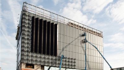 Tekst: To highlight the versatility of the activities that take place in the new Brussels iMAL, they are grouped around a unique void that extends over three floors and goes by the name of the ‘Aviary’. This structure in lacquered steel extends to the second floor and is clad in micro-perforated corrugated aluminium sheets that serve as both a transparent veil and a parapet. The undulation of the aluminium sheets is accommodated in the slender and lightweight supporting structure made up of seven 5,200 mm high frames measuring 3,000 mm by 100 mm (length x width). The hanger bars are matched to the corrugated metal and digitally cut out. The supporting structure was first installed between steel columns anchored in the floor, and the corrugated sheets then installed using a thousand dowels to allow for future replacement if necessary. The total length of the aluminium veil is 21 metres and all elements can be disassembled for reuse in future projects.