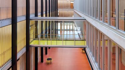 Tekst: <p>De loopbrug is het centrale object in het ruime, lichte atrium van de Internationale School van Differdange (LU). Het wordt ondersteund door krachtige kolommen in gewalst HEB400-staal, een herinnering aan het industriële verleden van de school. De loopbrug fungeert als verbinding tussen de klaslokalen langs de buitengevel en de sporthal in het midden van het gebouw. </p>