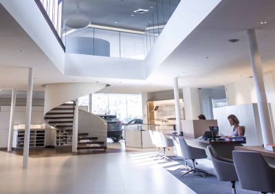 Tekst: Het oorspronkelijke, mooi op het landschap inspelende, notariaat werd slechts een goede vijf jaar geleden in gebruik genomen, maar een uitbreiding drong zich reeds op. Het doordachte ontwerp van destijds verdraagt geen verderzetting of kopie; een radicaal andere invalshoek was nodig. Tegenover het massieve bakstenen hoofdvolume wordt een nieuwe spiegeldoos geplaatst. De spiegelende buitengevel is opgebouwd uit 1mm dunne, verdiepingshoge roestvrijstalen panelen.