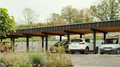 <p> De carports, de belangrijkste staalconstructies, staan tegenover het hoofdgebouw. Ze worden gekenmerkt door hun π-vormige portieken, uniform gemaakt van HEB160-balken. Staal, gekozen vanwege zijn structurele sterkte en lichtheid, contrasteert met de dikte van de houten groene daken. De eenvoudige, robuuste montage met vier M12 bouten versnelt de installatie aan het einde van de bouwplaats, zodat het werk snel en nauwkeurig kan worden uitgevoerd op een toch al drukke bouwplaats. </p>