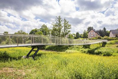 Tekst: <p>Het gemeentebestuur van Bissen wilde een nieuwe verbindingsas voor zachte mobiliteit tussen twee nieuwe verkavelingen aan de Route de Colmar en de Rue des Moulins, aan weerszijden van de Attert-rivier. Een oversteek die dankbaar gebruikt wordt door scholieren die zich naar de verschillende scholen in het centrum begeven. <br>