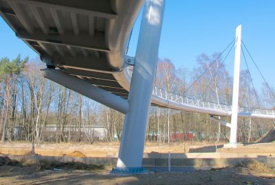 Tekst: <p>De voetgangers- en fietsersbrug te Beernem verbindt niet enkel de jachtpaden langs het kanaal Gent-Oostende, maar ze verschaft fietsers en voetgangers ook een veilige verbinding tussen het station en de stadskern.<br>De brug laat zich omschrijven als een voorgespannen tuikabelbrug met een gemengd staal-beton wegdek. De 98 m lange overspanning hangt op aan vijf paar tuien. Deze zijn verbonden aan één enkele A-vormige pyloon met ellipsvormige benen die op zijn beurt gestabiliseerd worden door twee trekkers. Ten slotte zorgen de funderingen ervoor dat er een gesloten systeem is zodat er nergens overdreven horizontale krachten ontstaan ten gevolge van verticale belastingen.</p>