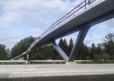 Tekst: <p>Afin de contourner les carrefours dangereux de la Luchthavenlaan à Machelen, on a choisi d’aménager parallèlement à celle-ci une piste cyclable et une passerelle pour cyclistes au-dessus de la E19. Il s’agit d’une passerelle 100 % en acier. Elle est constituée de deux parties : un avant-pont et le pont en arc. L’avant-pont est un pont portique ; le tablier est posé sur des poteaux obliques faisant office de portiques. Le tablier consiste en deux poutres principales creuses encadrant un tablier orthotrope. Les poteaux et les poutres transversales ont également une section creuse. L’avant-pont est équipé d’un système de conservation à trois niveaux. Le pont métallisé en arc est constitué d’un arc de section creuse variable. L’arc se dédouble à l’approche de la naissance de l’arc. Le tablier est placé entre les arcs, son concept est identique à celui de l’avant-pont. </p>