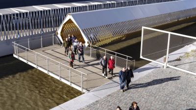 Tekst: <p>De nieuwe cruiseterminal aan de Schelde ligt bij het historische centrum van Antwerpen. Twee identieke passerellen overspannen de kade naar een tussenponton, dat op zijn beurt aansluit op het hoofdponton. </p>