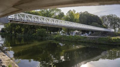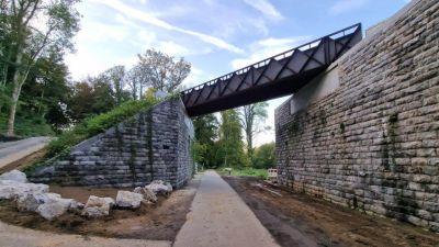 Tekst: <p>Het plan was om een haalbare verbinding te maken voor diverse gebruikers tussen de twee RAVeL-lijnen (137 en 138) (Réseau Autonome de Voies Lentes - Autonoom netwerk van trage wegen) door een hellingbaan aan te leggen en een nieuwe fiets- voetgangersbrug te installeren op de plaats van het oude brugdek, die vele jaren geleden werd ontmanteld.</p>