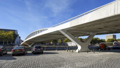 <p>Het resultaat is slanke brug met hoofdoverspanning van 60 m opgebouwd uit een uitgesproken dunne structurele nagespannen betonplaat van 45 cm dik tussen langsbalken, opgehangen aan stalen bogen en plaatvormige hangers. Het voetgangersgedeelte bestaat uit een roestvrij stalen draagstructuur in uitkraging met een dikte van 25 cm. In beide zijoverspanningen van 27 m lang zijn de stalen bogen vervangen door betonnen balken met variabele hoogte.</p>