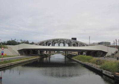 Tekst: <p>Het Albertkanaal, de belangrijkste waterweg in Vlaanderen, ondergaat aanzienlijke verbeteringen om de capaciteit voor binnenvaart te vergroten. Als onderdeel van het project "Verhogen bruggen Albertkanaal" is bij Merksem, Antwerpen, een bocht in het kanaal verbreed en de doorvaarthoogte vergroot . De nieuwe brug, bestaande uit drie naast elkaar gelegen stalen bruggen valt op door de donkere onderbouw en de witte, opengewerkte constructie. </p>