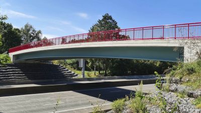 Tekst: <p>De fietsbrug zorgt ervoor dat fietsverkeer de autosnelweg E40 kan kruisen met twee fietsstroken van 2,5 m. Met één rijvak zullen auto’s beurtelings over de brug kunnen rijden. De brug is een vervanging van een voorgespannen brug die moest afgebroken worden na een aanrijding. Er werd een grotere overspanning voorzien om mogelijke uitbreiding van de onderliggende autosnelweg toe te laten. </p>