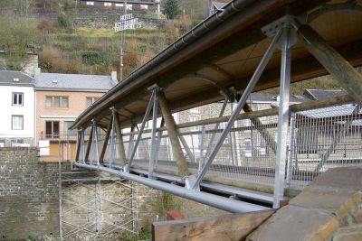 Tekst: De schuin lopende voetgangersbrug verbindt op discrete wijze twee wijken van Barvaux. Hij is 48,50 m lang (maximale overspanning: 30 m) en werd uit besparingsoverwegingen zo licht mogelijk gebouwd. Zo bedraagt het totaalgewicht van het gebruikte staal (S235 en S355), leuning inbegrepen, niet meer dan 21,5 ton en kon het volledige kunstwerk in een enkele kraanbeweging op zijn steunen geplaatst worden.