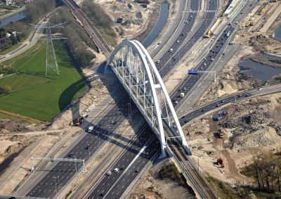 Tekst: <p>De Hovenring is een zwevende fietsrotonde en markeert met haar indrukwekkende pyloon de entree tot Eindhoven.</p><p>De imposante stalen pyloon van 70 m hoog en het slanke cirkelvormige brugdek met een doorsnede van 72 m vormen een nieuw landmark. Ook ’s avonds, want dan is de brug spectaculair verlicht, wat past bij de identiteit van Eindhoven als Lichtstad.</p><p>Om de hellingsgraad voor fietsers comfortabel te houden, werd het kruispunt verdiept aangelegd. Hierdoor werd het hoogteverschil voor fietsers teruggebracht tot 1,5 m.<br />Het zwevende brugdek is bovenaan met 24 stalen tuien aan de pyloon bevestigd en onderaan met stalen M-vormige steunpunten. Deze bestaat uit twee sigaarvormige drukstaven die samen een V vormen, met aan de buitenzijde daarvan twee trekstangen. Daardoor ontstaat uiteindelijk een M-vormig steunpunt.Verder heeft het brugdek een doosconstructie waarbij ribben op 332 mm hart op hart zowel aan de onder- als bovenplaat zijn gelast. Hiermee wordt een maximale slankheid verkregen.</p>