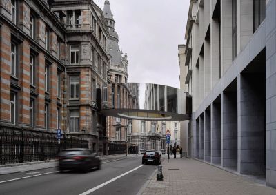 Tekst: <p>Federale parlementsleden die zich moeten verplaatsen tussen het historische Huis van de Parlementsleden in Brussel en het Forumgebouw, het nieuwe vergadercomplex aan de overkant van de straat, hoeven dat voortaan niet meer in openlucht te doen. Sinds kort kunnen ze de oversteek maken via een fraaie ringvormige passerelle met spiegelgevels. De licht hellende brug kreeg de naam ‘Tondo’, naar de ronde schilderijtjes die erg populair waren tijdens de Renaissance.</p><p>De passerelle is grotendeels opgetrokken uit staal en kan in structureel opzicht getypeerd worden als een stijve schijf. Het dak doet dienst als hoofddraagstructuur en is opgevat als een holle koker met ribben in staalplaat. Elke rib werd gepositioneerd in functie van het krachtenverloop en geoptimaliseerd om tot een minimaal gewicht te komen. De hellende vloer is met behulp van 32 witte stalen trekkers opgehangen aan het dak om de vrije ruimte onder de brugconstructie te maximaliseren. </p>