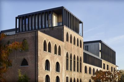 Tekst: Capawood, un ensemble d’entrepôts en briques, fait partie du complexe habitat-travail qui se dresse sur l’ancien site industriel du canal à Wijnegem. Pour la réaffectation des bâtiments, les entrepôts ont reçu comme ajout un rehaussement en acier constitué d’un système porteur extérieur de colonnes de gaines en acier soudées entre lesquelles des dalles de sol sont suspendues. La structure en acier ouverte de la construction supérieure contraste avec le caractère monolithique de la construction inférieure en briques.